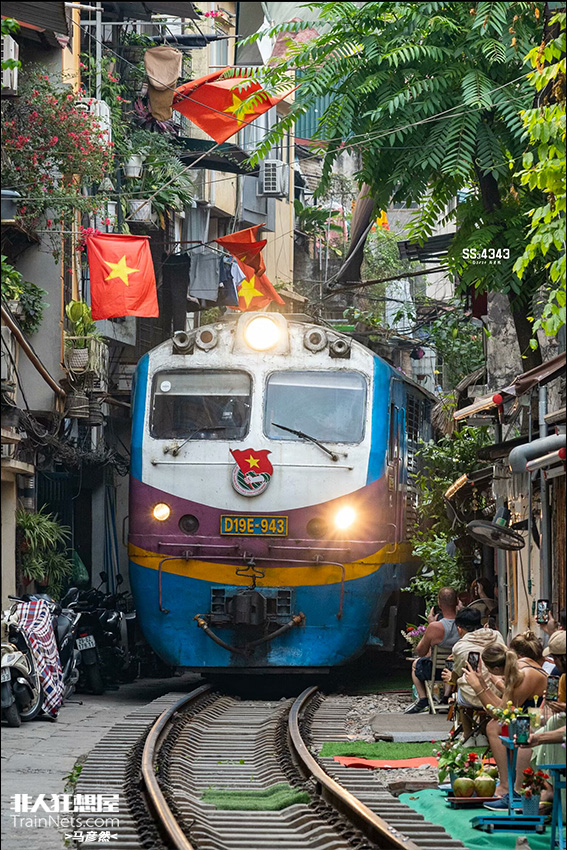 2024年5月,越南南北铁路,挂牌D19E牵引客车通过河内著名景点火车街。