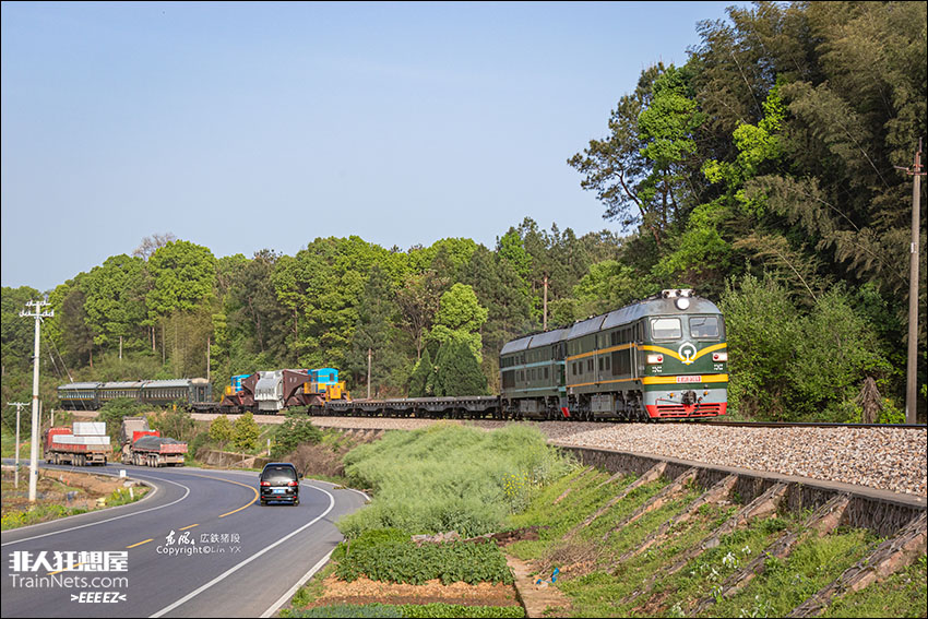 2025年4月13日,异色双机东风4牵引超限列车70003次经过湘桂线某弯道,该列车为特种车辆“钳夹车”DQ35运送超限货物发电机定子,横跨整个中国一路南下。
