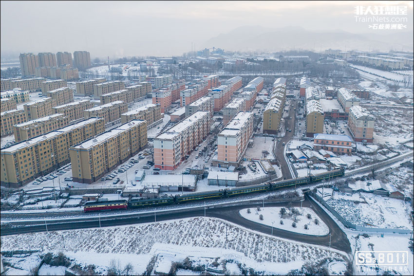 2025年1月10日,吉林通化,DF4D-0470牵引4347次列车(通化-集安)驶出通化站,列车穿越通化城市经梅集线向集安方向驶去。