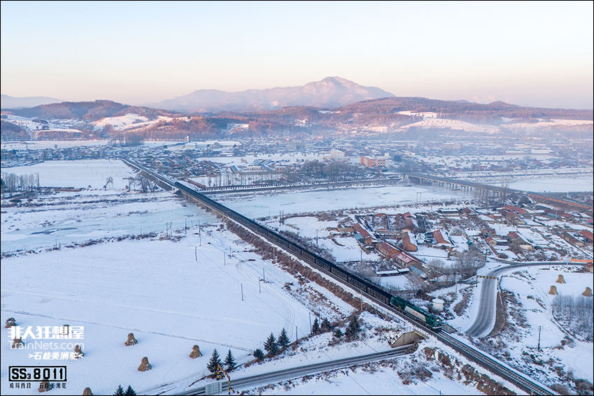 2025年1月11日,吉林通化,HXN5-2035牵引货列行驶在鸭大线鸭园站附近,清晨的东北山区覆盖着一层薄薄的水雾,在阳光的照射下,缓缓升起。