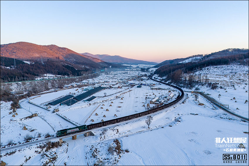 2025年1月12日黄昏,吉林通化,HXN5-2007牵引敞车大列行驶在梅集线通沟-干沟区间。列车在雪地中拐过一个大弯后,即将驶入通沟岭隧道。