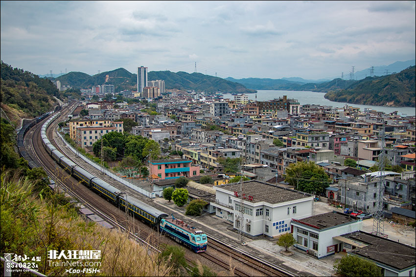 2025年2月7日,广东英德,SS8牵引旅客列车驶过北江畔的连江口站。