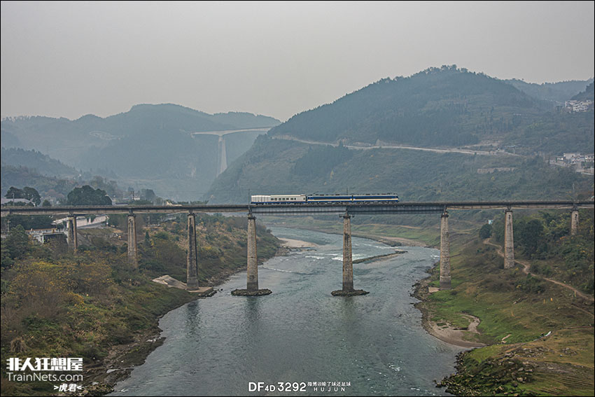 2025年1月。 贵州遵义。SS3B型电力机车牵引国铁集团隧道检测车通过贵州省文物保护单位川黔线乌江铁路大桥。