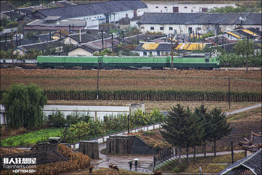 2024年10月1日,朝鲜南阳。一列朝鲜电力客车慢速驶出南阳火车站。