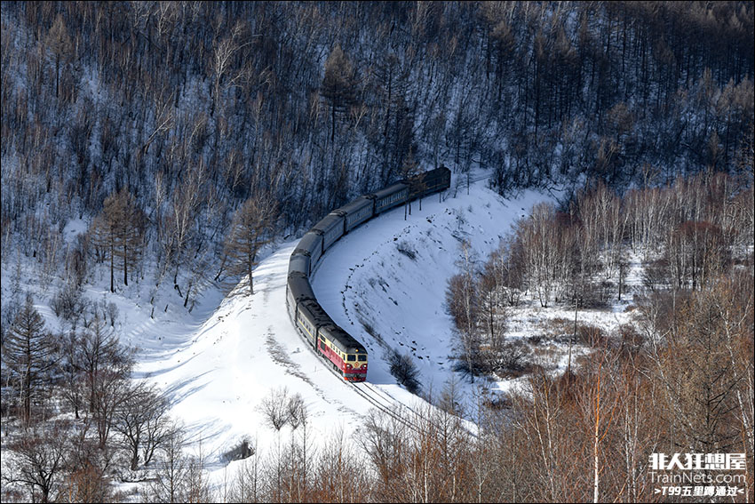 2025年2月16日,白阿线,沈局白段DF4D 0278牵引K7596次(阿尔山-白城)行驶在零下17度的密林间,即将进入北兴安隧道。