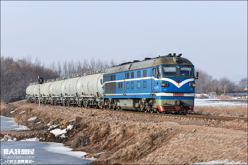 2025年3月15日,铁法线,蒸汽机车运行的间隙,涂装独特的DF4B 7772牵引铁法能源自备罐车前往大青站方向。