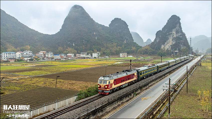 2025年2月。焦柳线成团站。检测大列在雨雾中进行检测作业,为运输安全保驾护航。