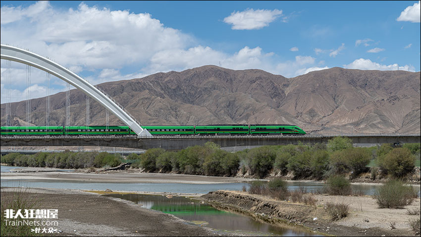 2025年5月13日,西藏日喀则拉日铁路,高原双源动集担当C887次(拉萨-日喀则)跨越江萨国家湿地公园,即将达到终点站日喀则站,该车为CR200JS-G首台车2901号。