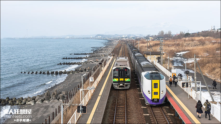 2024年2月,室兰本线上著名观海车站北周岡,下午乘坐H100系普通列车放学的高中生与正在通过车站的特急北斗列车,为这个无人小站带来一些人气。