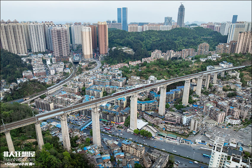 2025年4月15日,CRH3A-A驶过贵阳市区即将抵达贵阳站,高大的桥墩使列车像是在城市的顶端低空飞行。