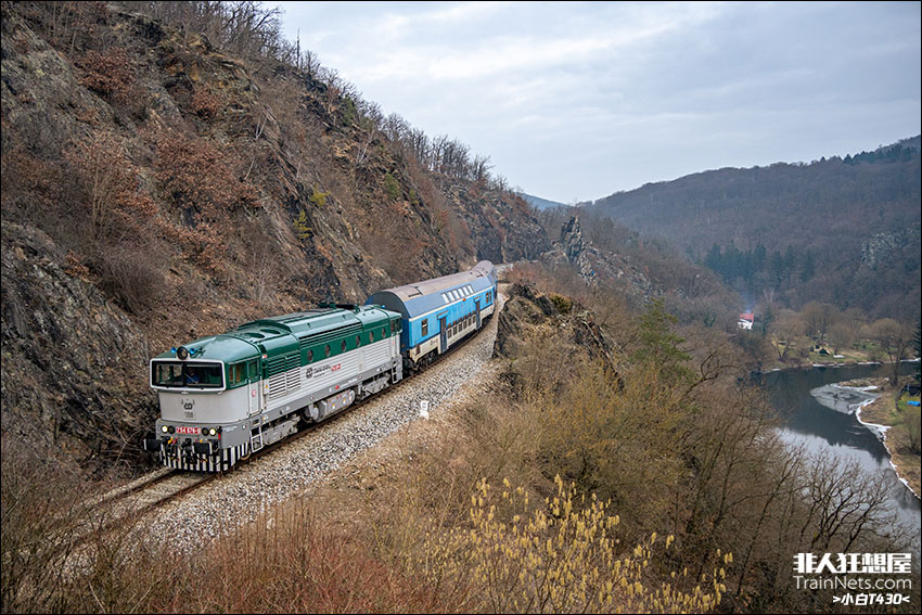 2024年11月,捷克布拉格地区南部,CD 754“潜水镜”机车牵引区域通勤的“湖蓝双层”列车行驶在悬崖峭壁旁。下方为伏尔塔瓦河支流。
