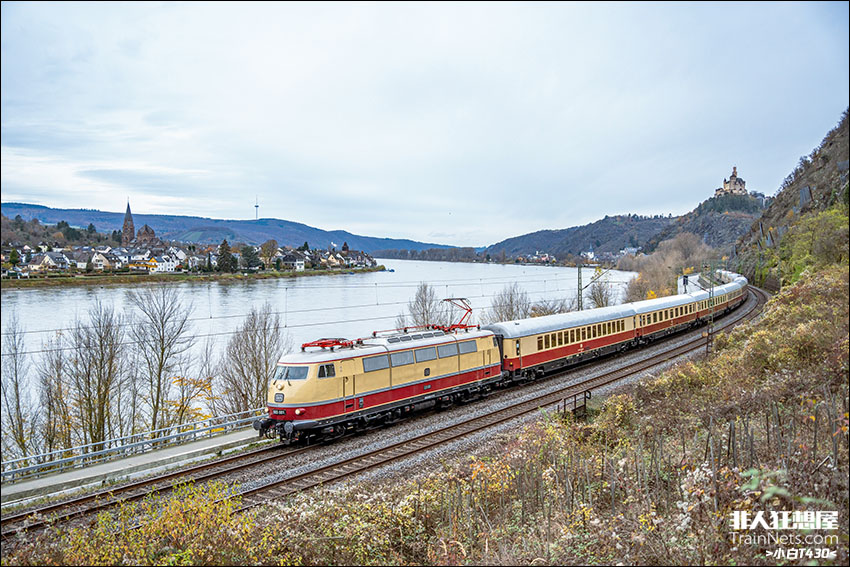 2024年11月23日,德国莱茵河,一代传奇E03-001牵引TEE列车行驶在莱茵河右岸铁路,右上角为1117年修建的Marksburg。