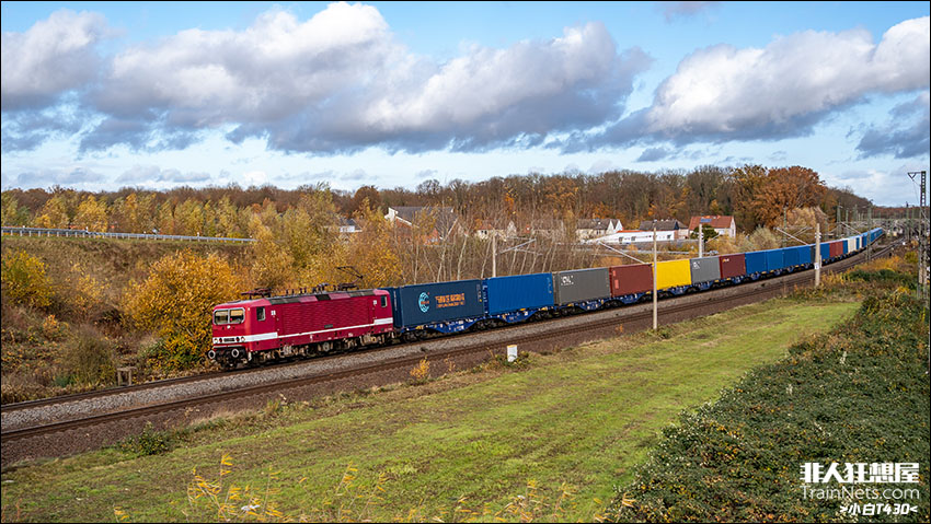 2024年11月秋季,德国北部下萨克森州汉诺威附近,DR涂装143机车牵引五颜六色的重庆-杜伊斯堡“中欧班列”。