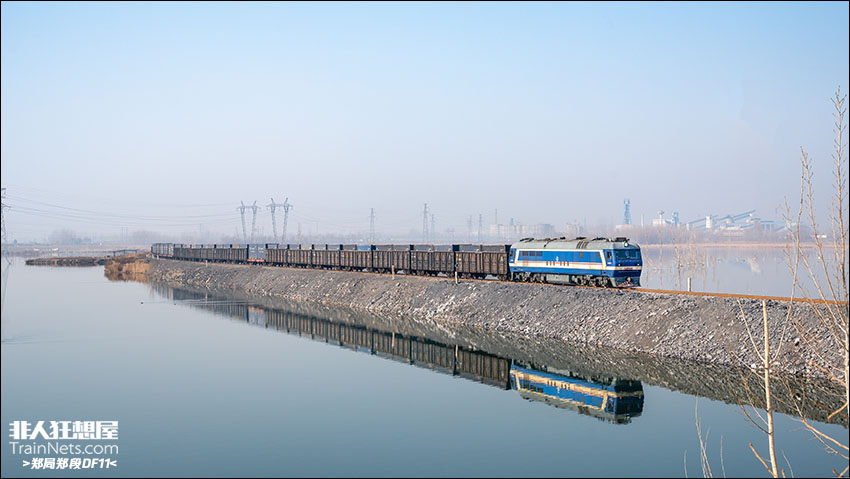 2025年2月,焦煤集团专用线,DF8B牵引货列行驶在湖中。