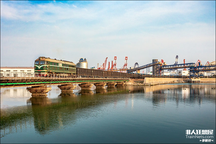 2025年5月25日。龙口港。东风4B-7576机车将货列从龙口港站倒推至龙口港内,等待装船。