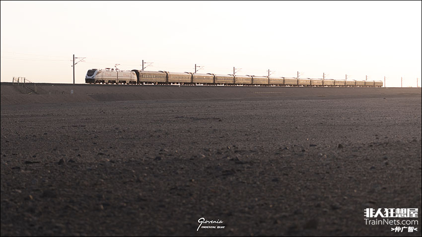 2025年6月1日,敦煌线伊塘湖-甜水井区间,FXD1G型0002号机车牵引K9670次(兰州-敦煌)奔跑在戈壁滩上。