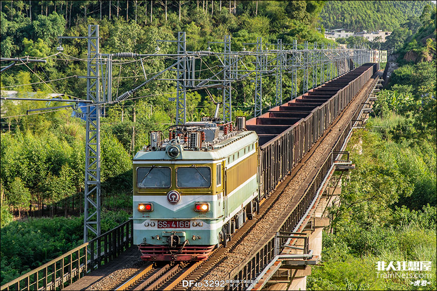2020年8月。广西南宁。南防线。配属沿海公司的SS3-4168号机车牵引货运列车接近那罗车站。