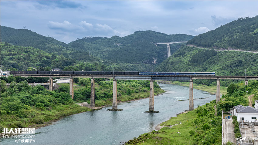 2025年6月4日,遵义市乌江镇。双机SS3B牵引货列行驶在川黔线乌江大桥上。背景后的高处桥梁为渝贵客专乌江特大桥。