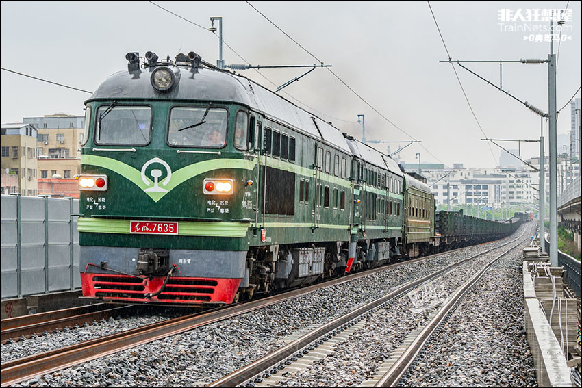 2025年6月14日。广东广州。结束广清城际南延段长轨换铺作业后,双机DF4B+DF4BK推挽长轨车在台风雨中奋力驶上白云湖站站前大坡道。