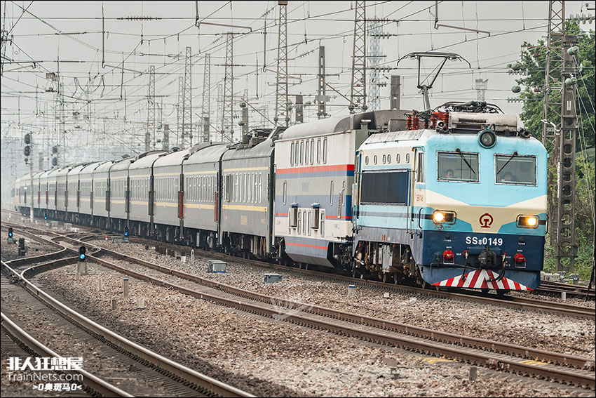 2025年3月28日。广东广州。SS8-0149执行57113次国铁京广巡检列车换向任务快速通过大朗站。SS8机车搭配机后原色双层检测车的组合显得极其美丽。