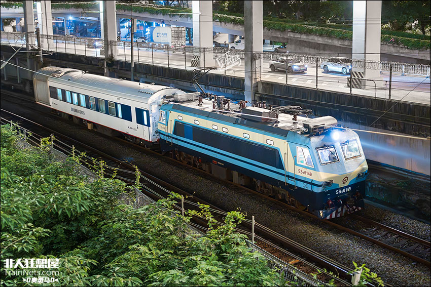 2025年6月6日。广东广州。SS8-0149牵引原色隧道检测车,执行57982次广深城际Ⅰ Ⅱ线检测任务通过广州小北路段,前往任务终点广州站。