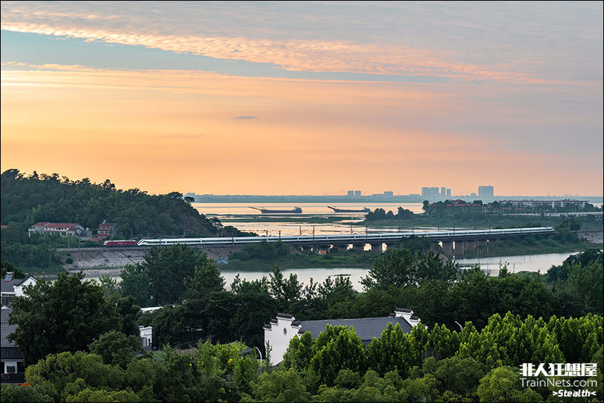 2025年6月12日,湖南岳阳,京广线,HXD1D机车牵引长编组“AD钙”动集开行00119次通过南津港站,路过夕阳下的洞庭湖畔。