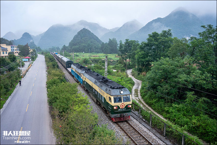 2024年8月14日,贵州黔南,黔桂线,超限车70001次使用“柳州虎”+“乌克兰”双机牵引一组DQ35钳夹车,在清晨蒙蒙亮的时刻里接近薄雾缭绕的麻尾站。