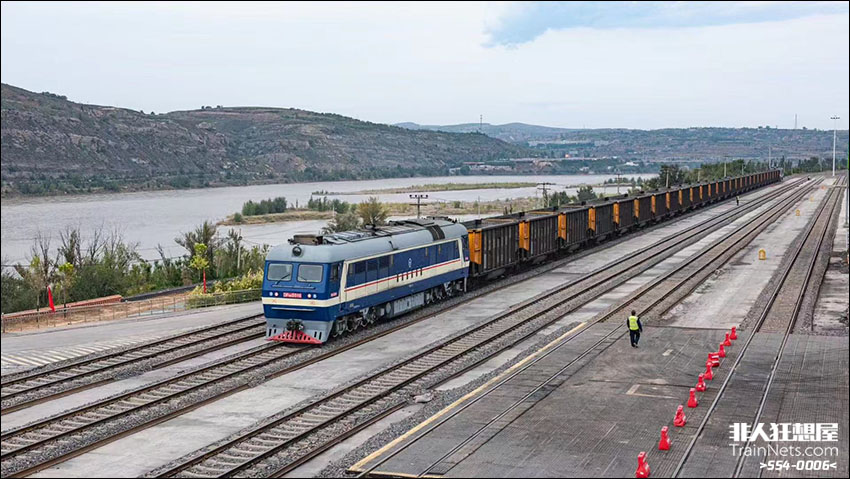 2025年10月,阴火线,晋神能源推挽DF8B牵引空车驶过黄河边的火山站。