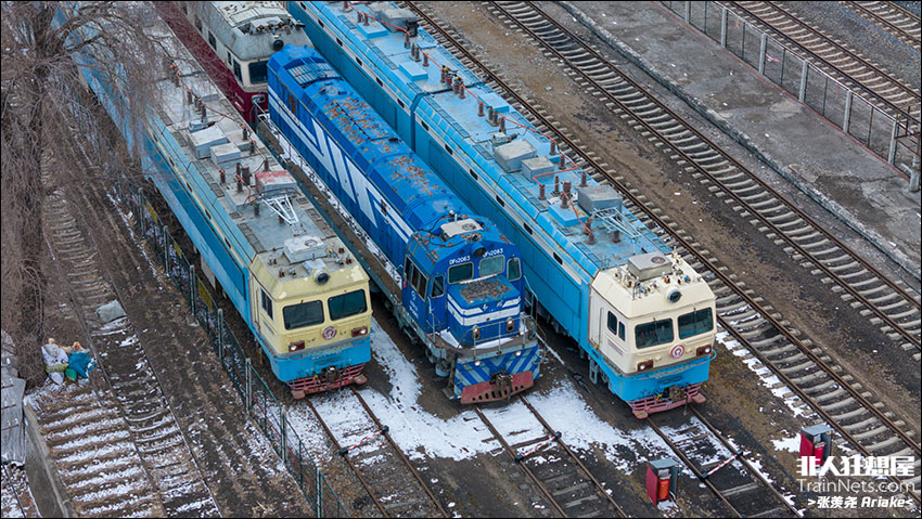 2025年3月,黑龙江省牡丹江市穆棱机车封存基地,滨绥旧线,封存于老穆棱站的韶山4G与DF5模块化机车。
