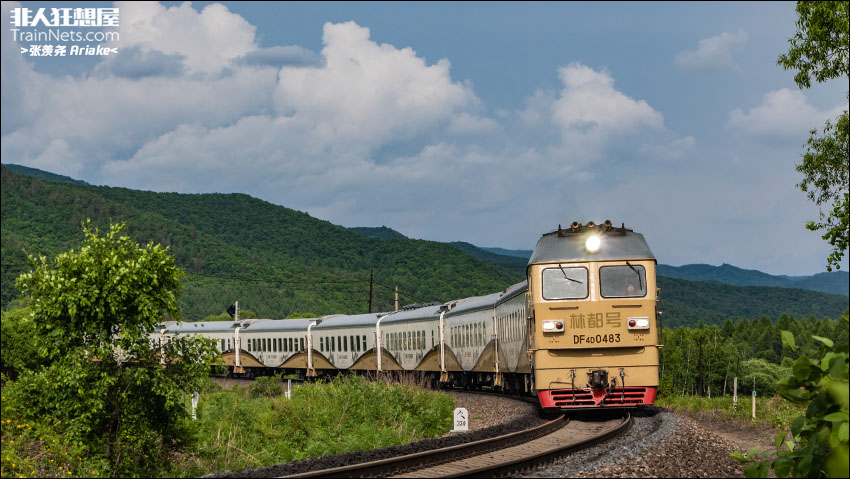 2024年6月,黑龙江省伊春市南岔线,哈局三段DF4D型牵引“林都号”旅游列车接近柳树站。