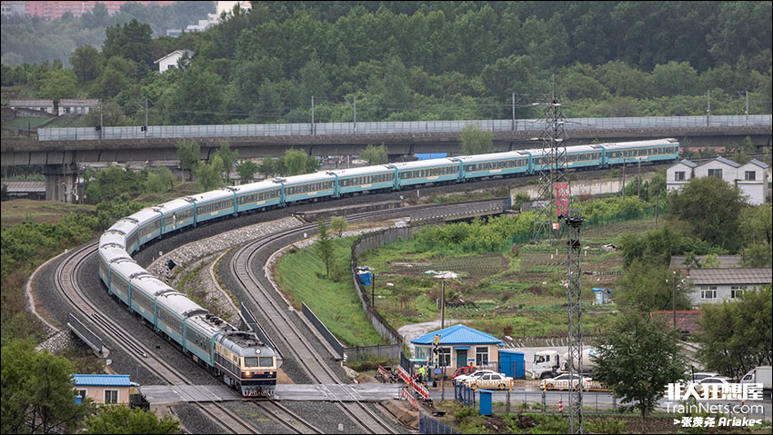 2024年5月,吉林省吉林市龙潭区,长图线龙潭山站,沈局吉段DF11型牵引Y357次“什邡号”旅游列车通过道口。