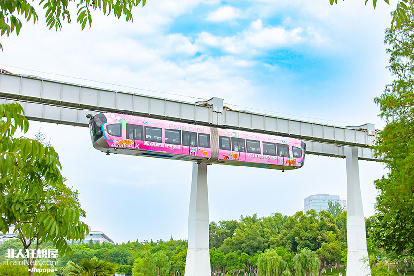 空轨列车穿行在春日绿叶中