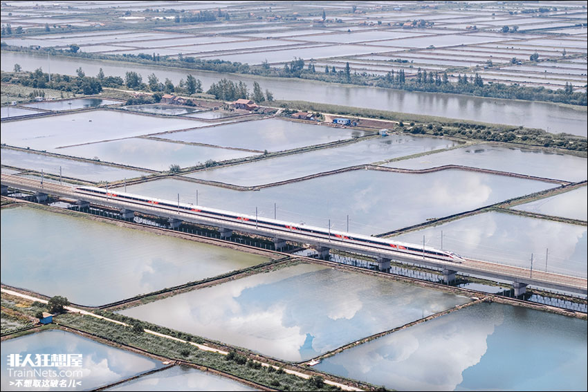 2025年6月,CR450AF型动车组行驶在沿江高铁武宜段进行400km/h+冲高实验。雨后的云彩倒映在一望无际的水田和鱼塘上。