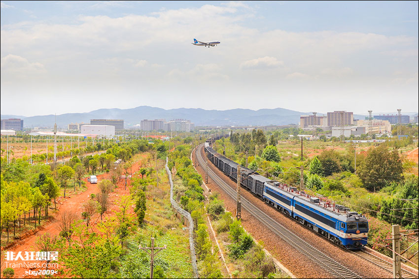 2025年5月,沪昆线,SS3B牵引上行货车通过长水机场附近,沪昆铁路绕开长水机场改线段正好位于跑道正下方,可以观赏到飞机和火车同框。