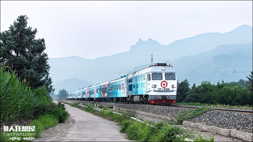 2025年7月10日。京承线,Y964次“星光燕赵号”接近上板城站,行经特色的鸡冠子山。