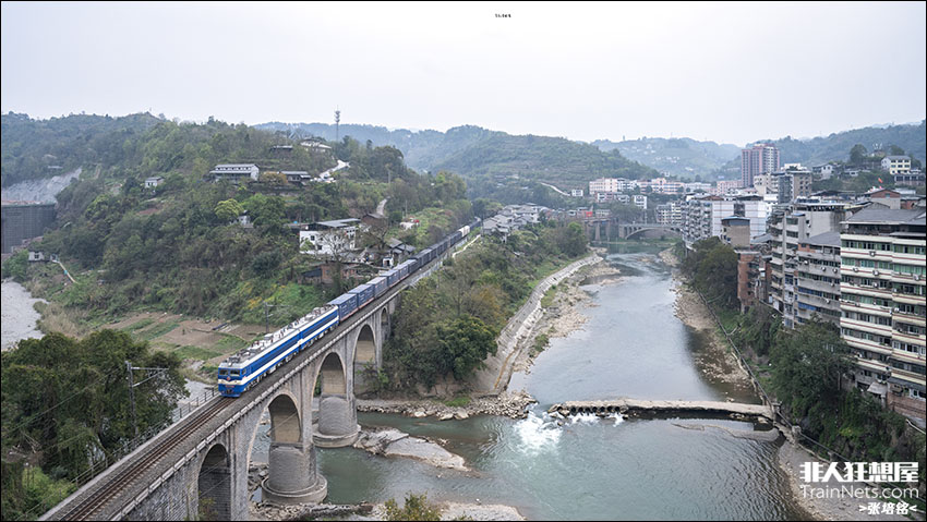 2025年4月5日,重庆綦江赶水镇,SS3B货列从渝贵交界开来,跨过汇入綦江的拱桥。
