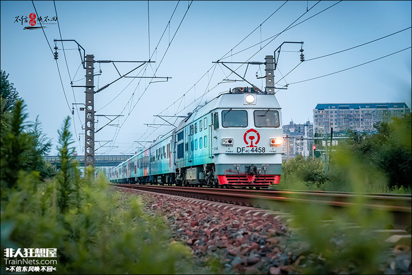 2025年7月,蓝调时刻,DF4C-4458牵引“星光·燕赵号”旅游专列在蝉鸣声中通过顺义车站。