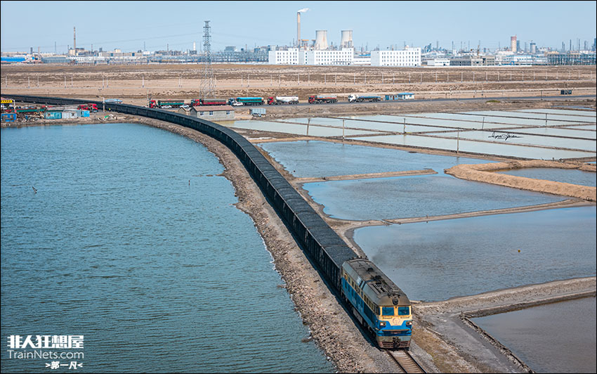 2025年4月9日。沧港铁路。沧港铁路公司自备DF4B-7492牵引敞车驶出沙胡同站附近的盐湖。