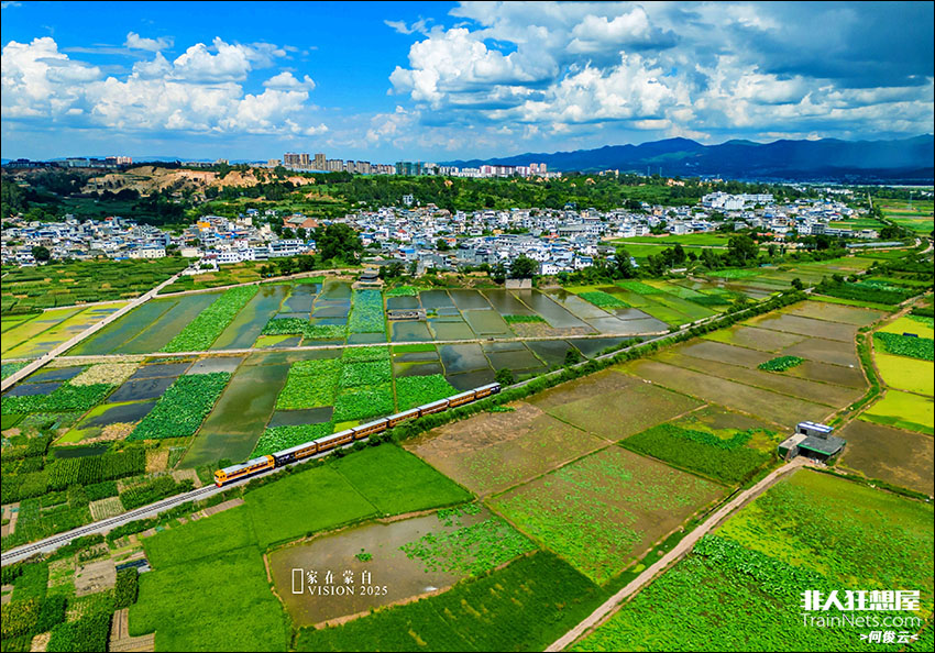 2024年7月。在“东边日出西边晒”的气候条件下,建水米轨观光车从大片的荷田中穿过。