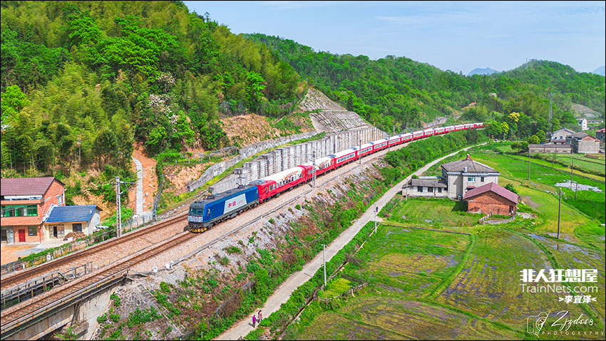 2025年4月13日,石长线,首尾4节“潇湘号”与“我的韶山行”旅游车混编,开55018次试运行,行驶在桃花江站附近的田野中。