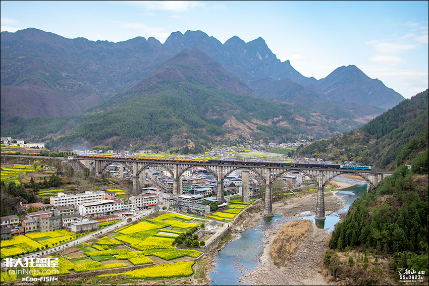 2025年3月15日,四川江油。SS4G牵引货列行驶在雁门大桥上。桥下油菜花盛开。