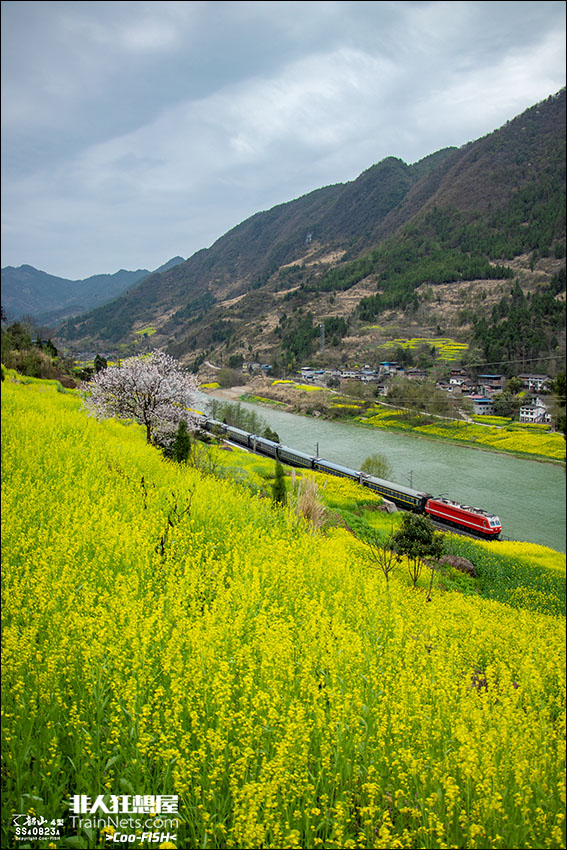 2025年3月15日,四川广元。SS7E牵引K568次列车(峨眉-乌鲁木齐)行驶在清江河畔的宝成铁路上。阳春三月的菜花盛开,黄色花丛中一株展放的樱花树更是增添了不少意境。