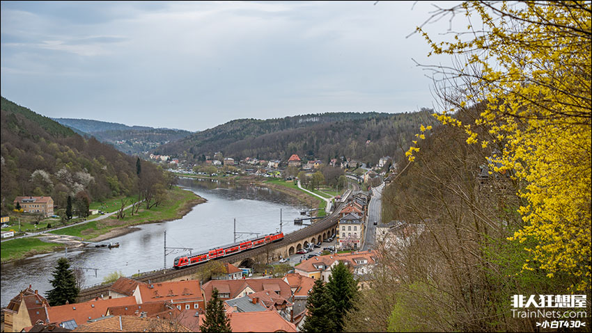 2025年4月,德国萨克森州与捷克的边境地区,一辆市郊S-Bahn列车行驶在易北河畔,即将停靠在Königstein。
