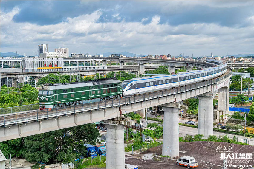 2025年6月23日,东风4-3600牵引长株潭城际动车组驶下江大联络线,一旁是即将竣工的广清城际南延江高站。