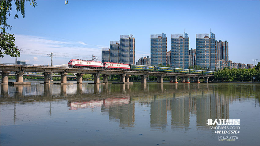 2024年8月,北京。双机SS9G牵引的K7784次(蓟州北-北京)通过通州北运河。
