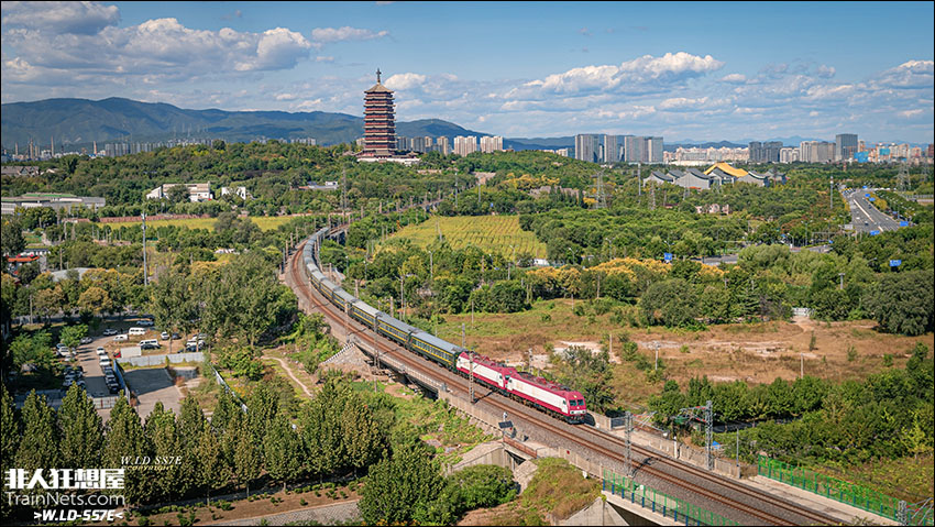 2023年9月,北京。永定塔下,双机SS9G牵引的国庆临客K5211次(北京西-邯郸)后吕村接近。