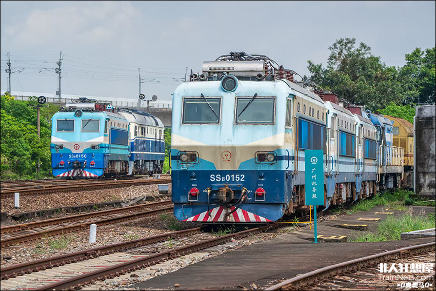 2025年8月21日。广东佛山。DF11-0016牵引SS8-0150在前往广湛高铁(湛江北-新兴南区段)进行热滑测试途中驶过封存于三水西机务段的三台SS8。