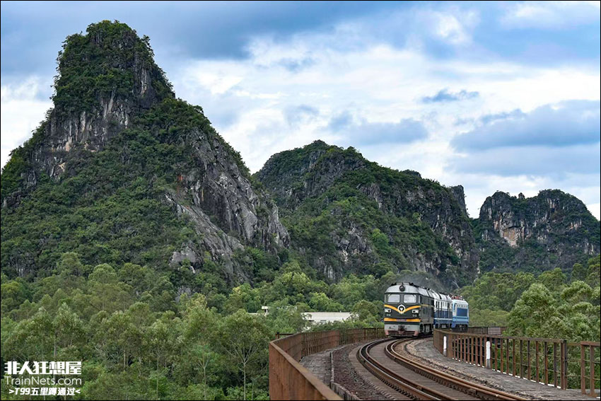 2025年8月21日,阳阳铁路,阳阳铁路自备的DF4B-3861回送广湛高铁做热滑的广铁广段DF11-0016与SS8-0150,机车串行驶在喀斯特山下。