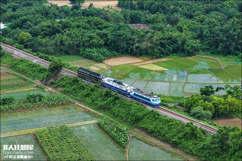 2025年8月21日,阳阳铁路,前往广湛高铁为热滑做准备的“临时动车组”穿过阳春的田野。这也是SS8-0150自7月18日结束牵引任务后的第一次复出。