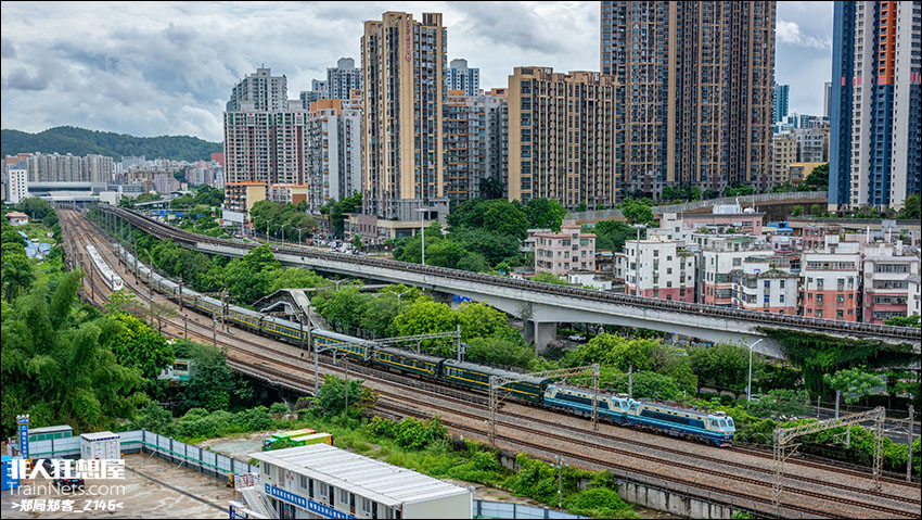 2025年7月,深圳东-笋岗区间。Z8006次(深圳东-海口)复开并图定,K1231次(湛江-深圳东)双机送Z8006次本务机。